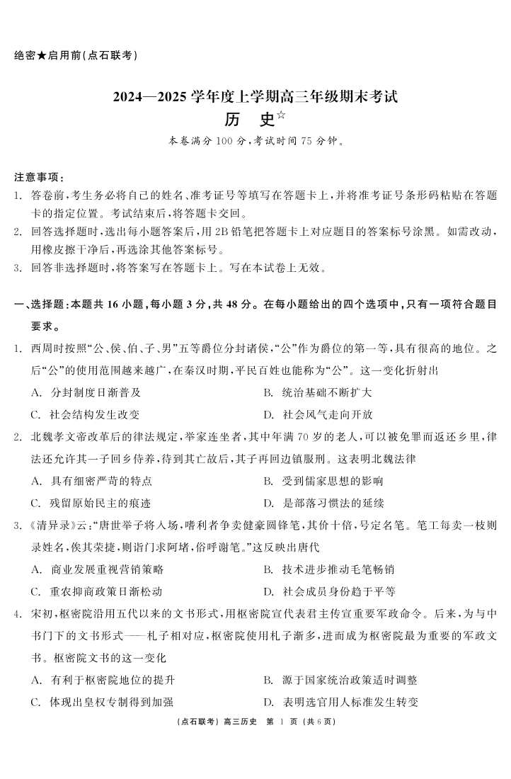 辽宁省点石联考2025届高三上学期1月期末考试历史
