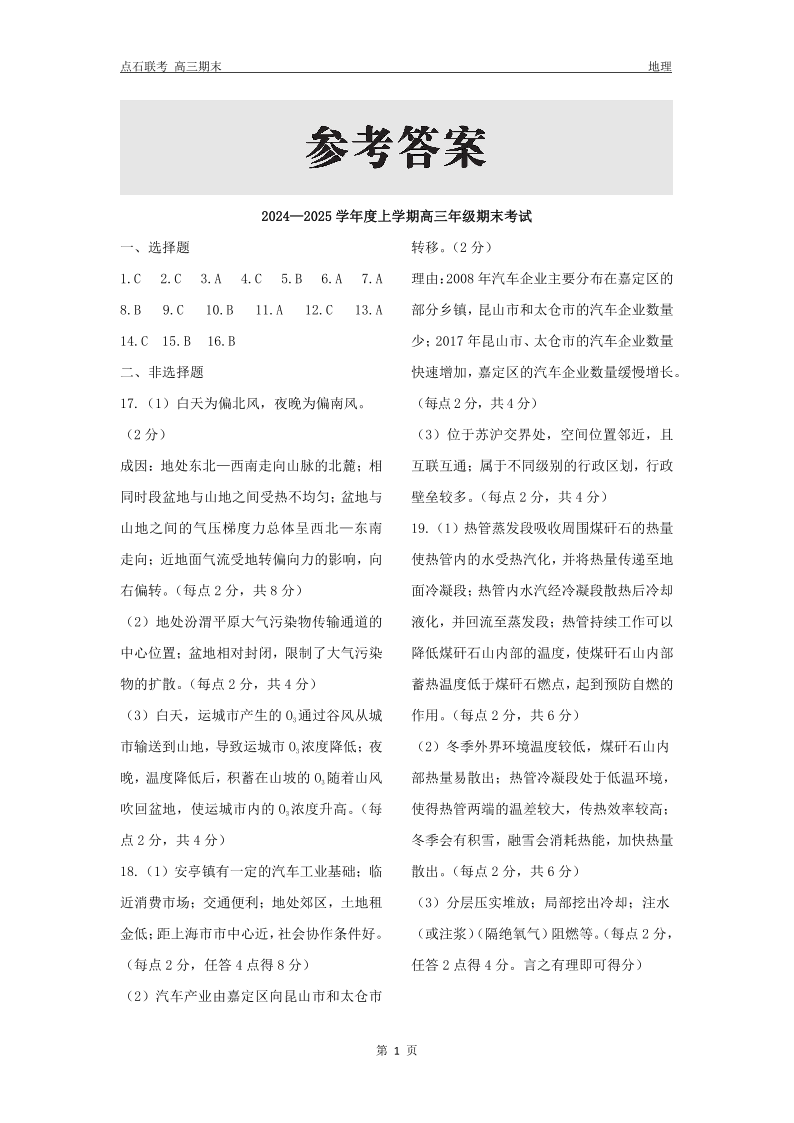 辽宁省点石联考2025届高三上学期1月期末考试地理答案
