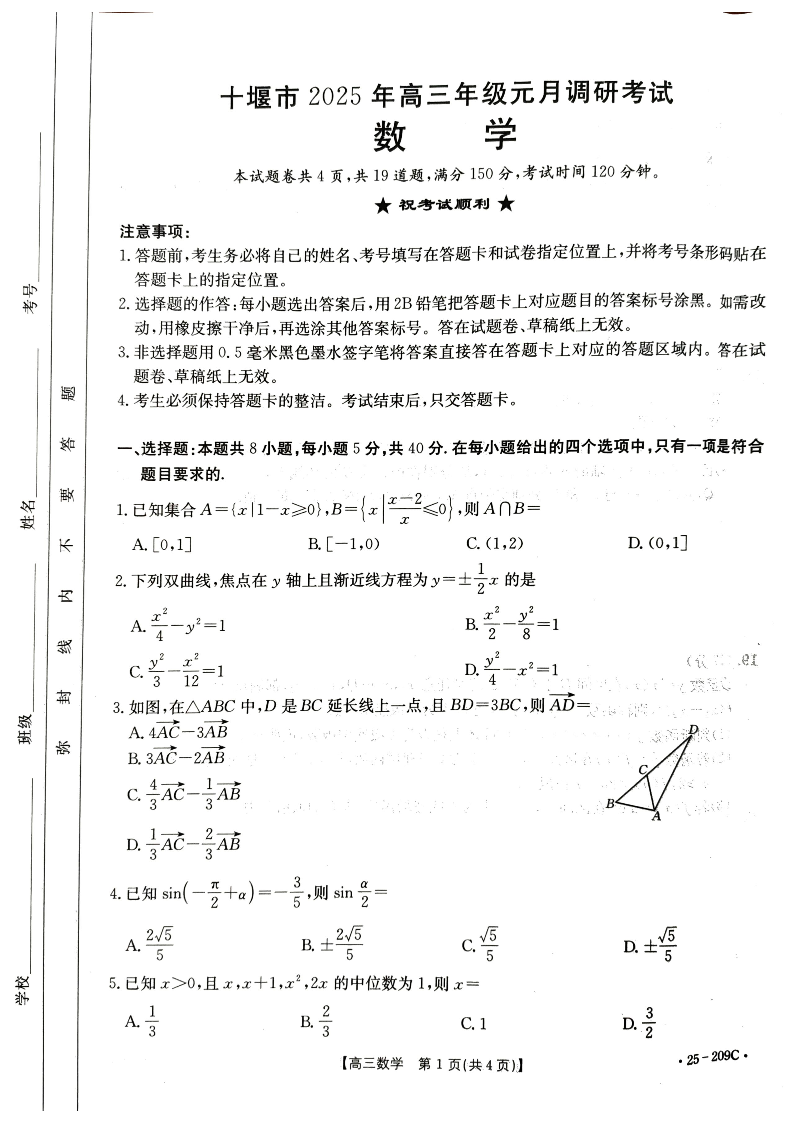 湖北省十堰市2025年高三年级元月调研考试数学