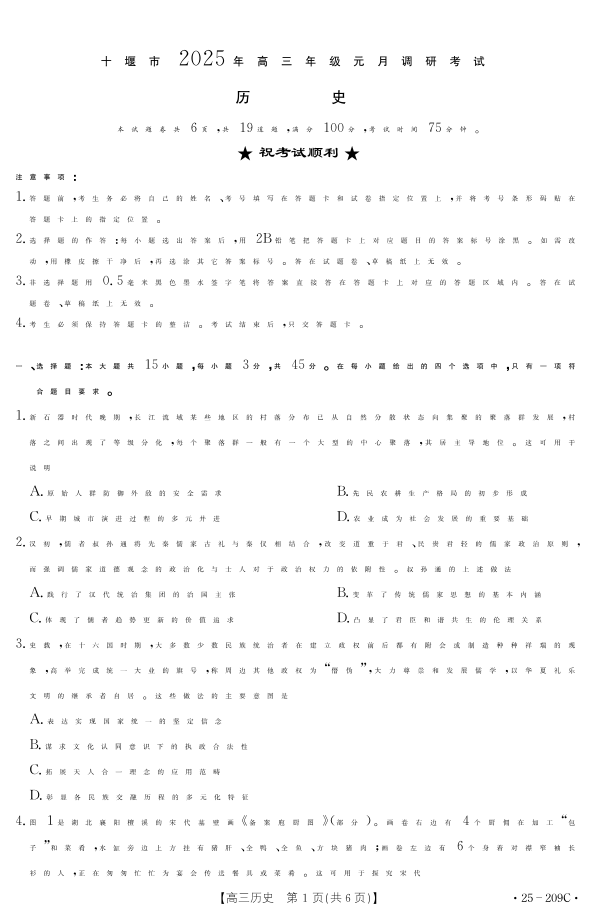 湖北省十堰市2025年高三年级元月调研考试历史