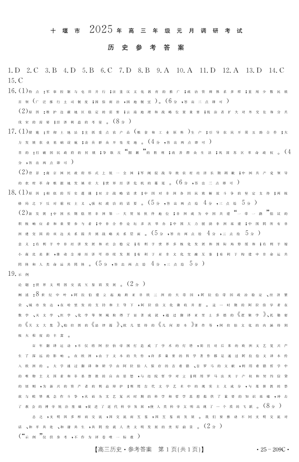 湖北省十堰市2025年高三年级元月调研考试历史答案