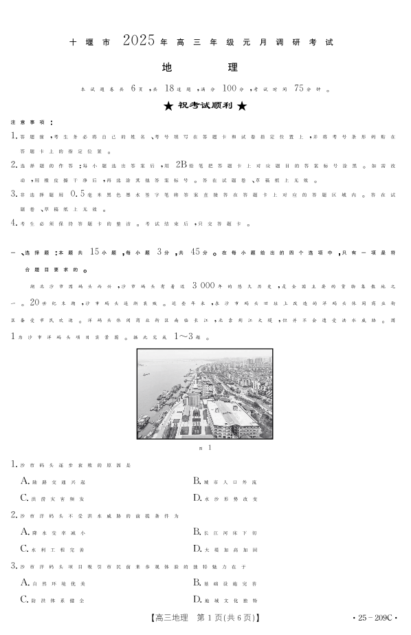 湖北省十堰市2025年高三年级元月调研考试地理