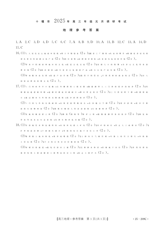 湖北省十堰市2025年高三年级元月调研考试地理答案