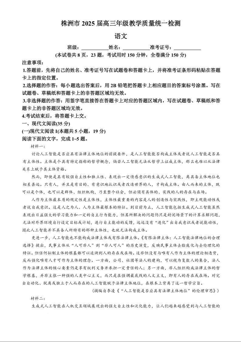 湖南省株洲市2025届高三年级教学质量统一检测(一模)语文
