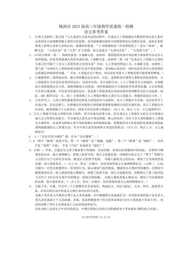 湖南省株洲市2025届高三年级教学质量统一检测(一模)语文答案
