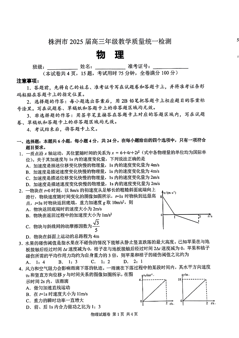 湖南省株洲市2025届高三年级教学质量统一检测(一模)物理