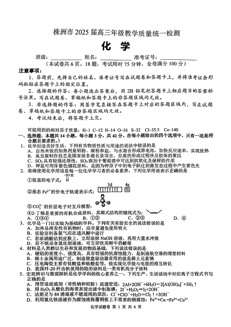 湖南省株洲市2025届高三年级教学质量统一检测(一模)化学