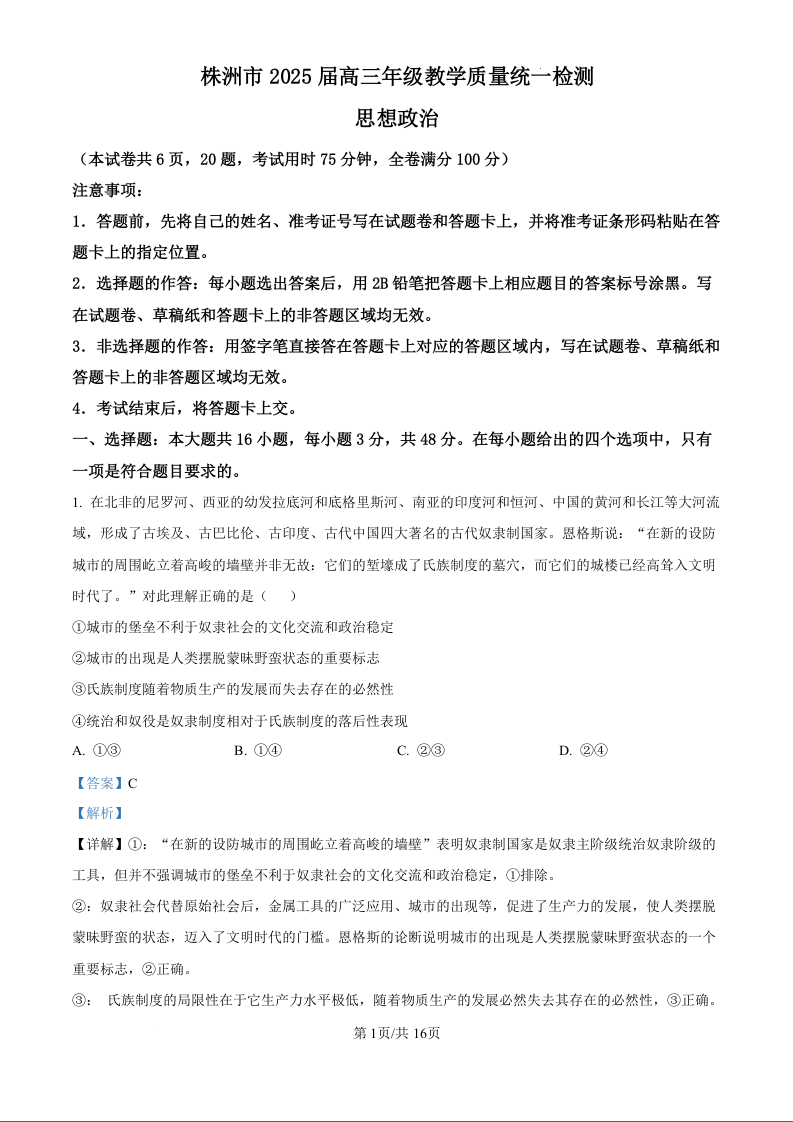 湖南省株洲市2025届高三年级教学质量统一检测(一模)政治(精品解析版)