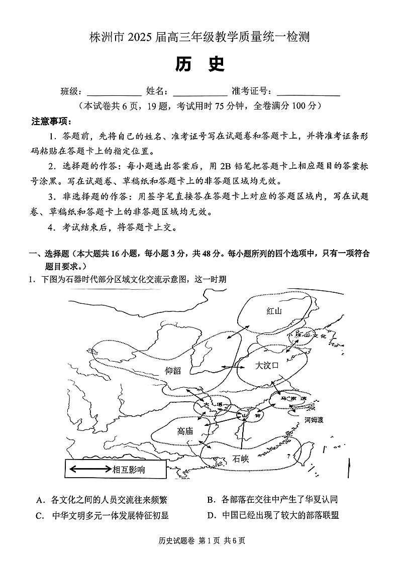 湖南省株洲市2025届高三年级教学质量统一检测(一模)历史