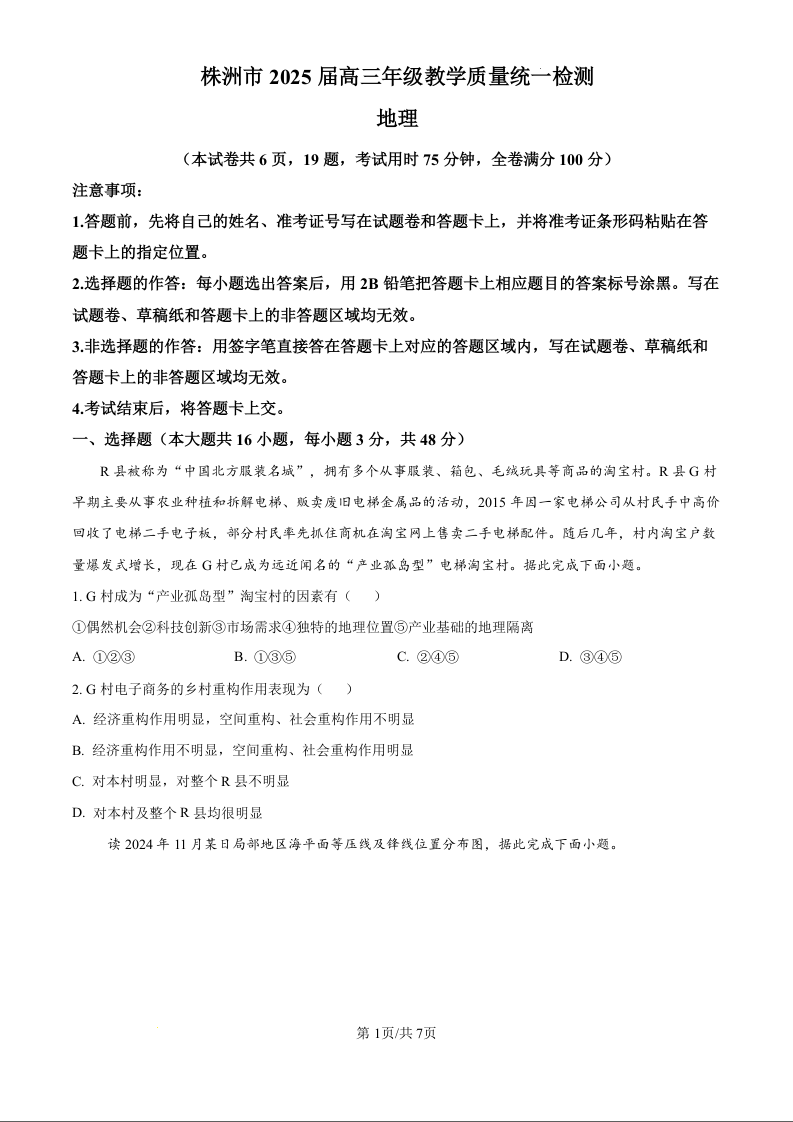 湖南省株洲市2025届高三年级教学质量统一检测(一模)地理(原卷版)