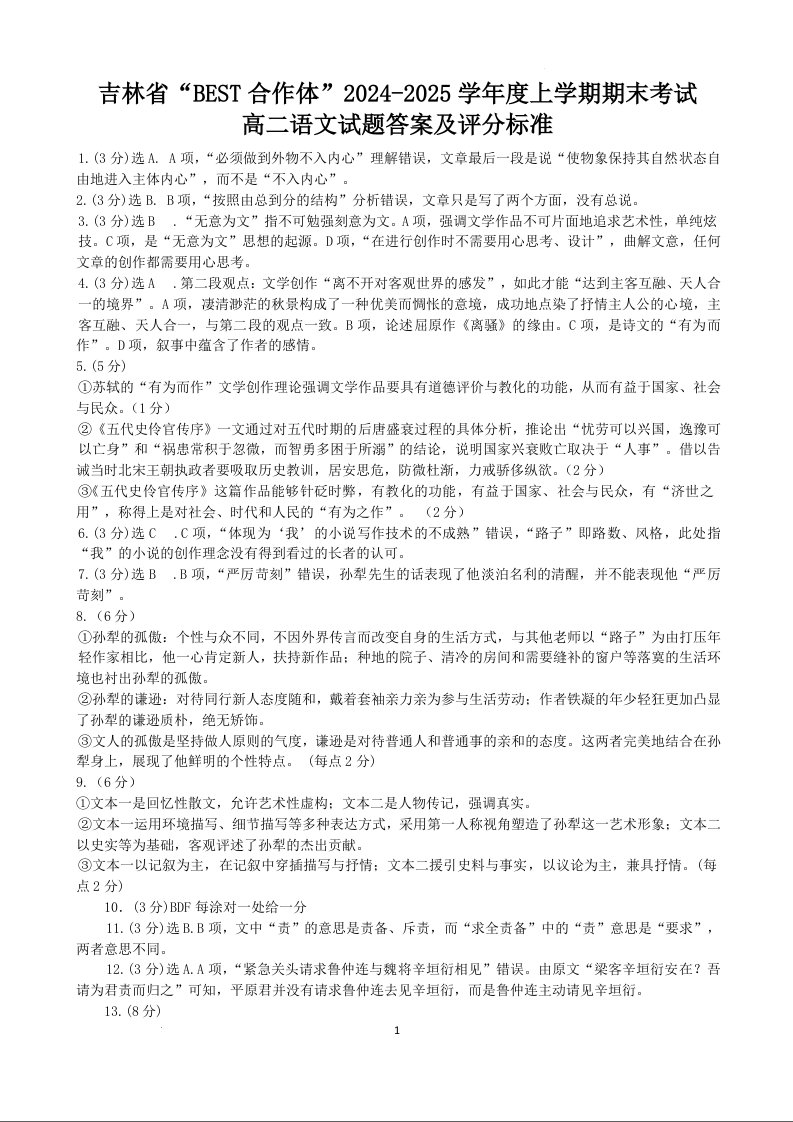 吉林省“BEST合作体”2024-2025学年高二上学期期末考试语文答案