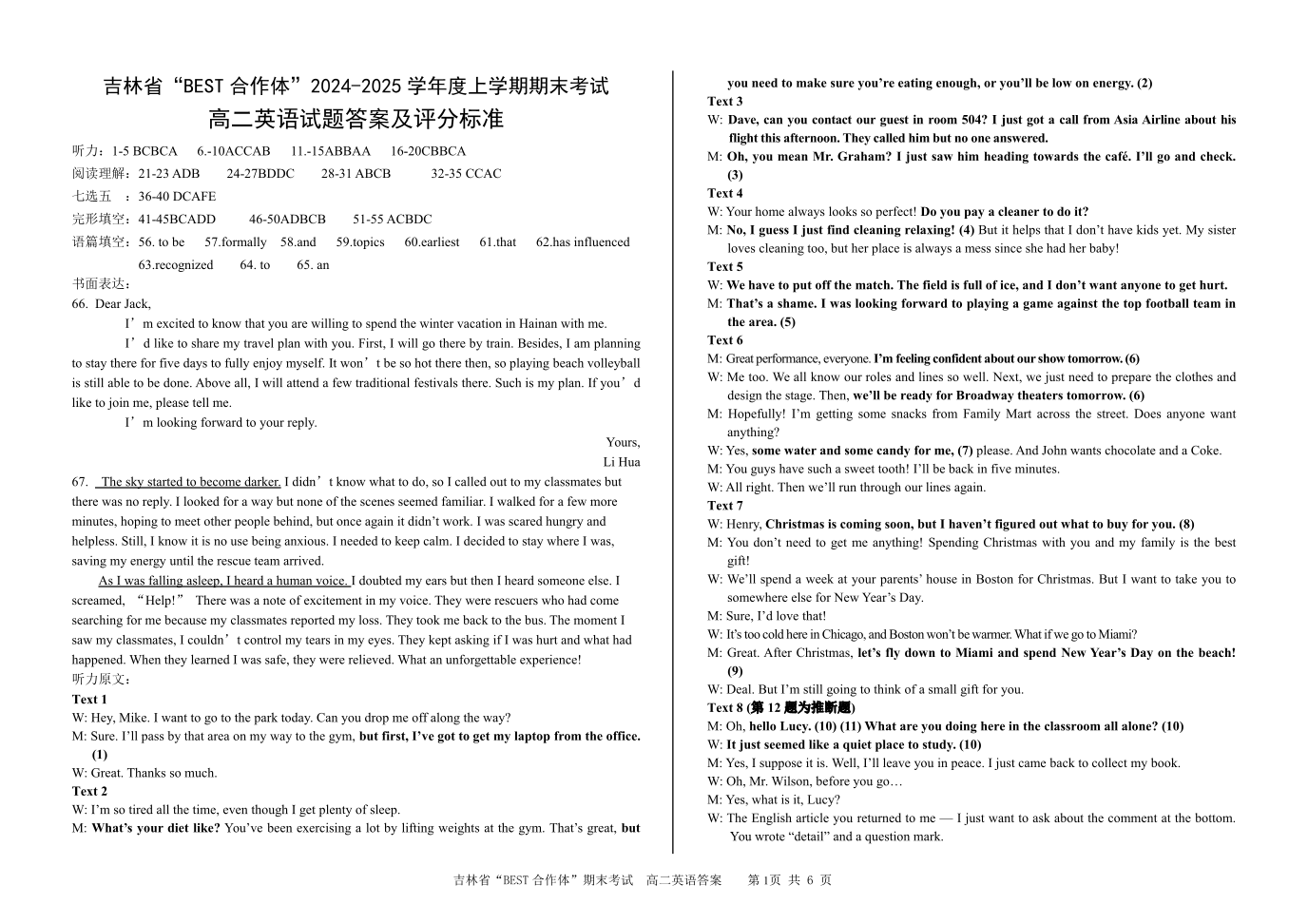 吉林省“BEST合作体”2024-2025学年高二上学期期末考试英语答案