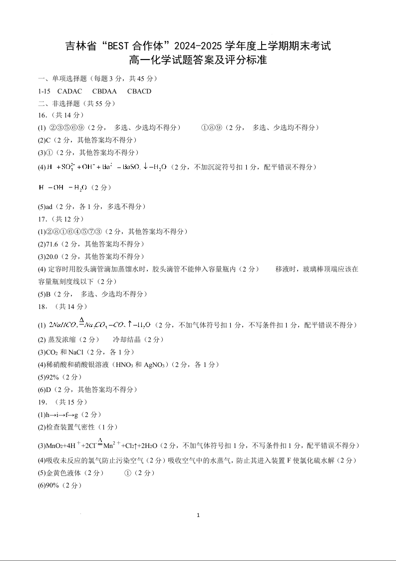 吉林省“BEST合作体”2024-2025学年高二上学期期末考试化学答案