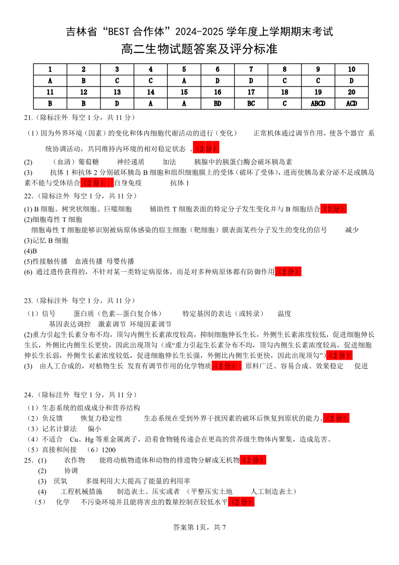 吉林省“BEST合作体”2024-2025学年高二上学期期末考试生物答案