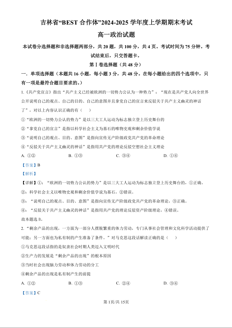 吉林省“BEST合作体”2024-2025学年高二上学期期末考试政治(精品解析版)