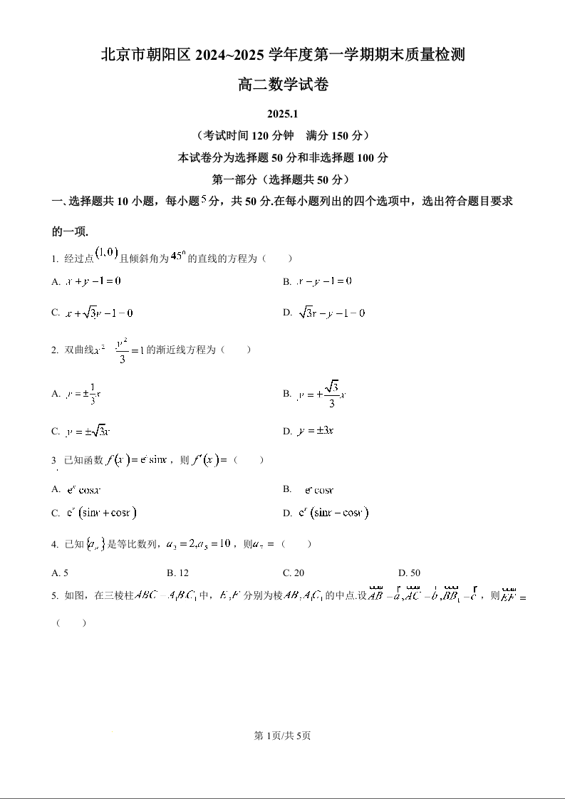 北京市朝阳区2024-2025学年高二年级上学期期末质量检测数学(原卷版)