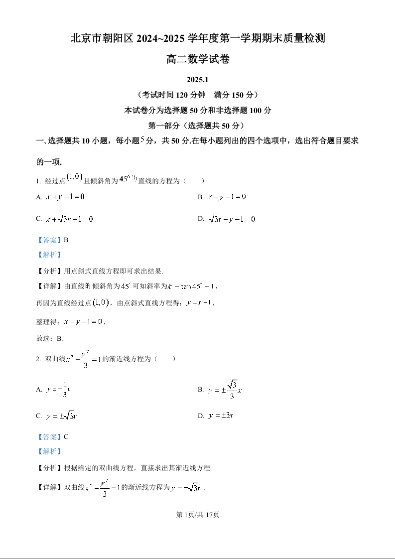 北京市朝阳区2024-2025学年高二年级上学期期末质量检测数学(精品解析版)