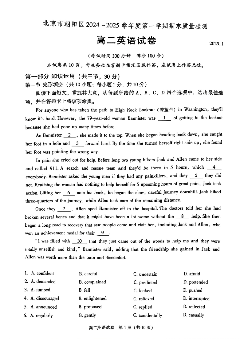 北京市朝阳区2024-2025学年高二年级上学期期末质量检测英语
