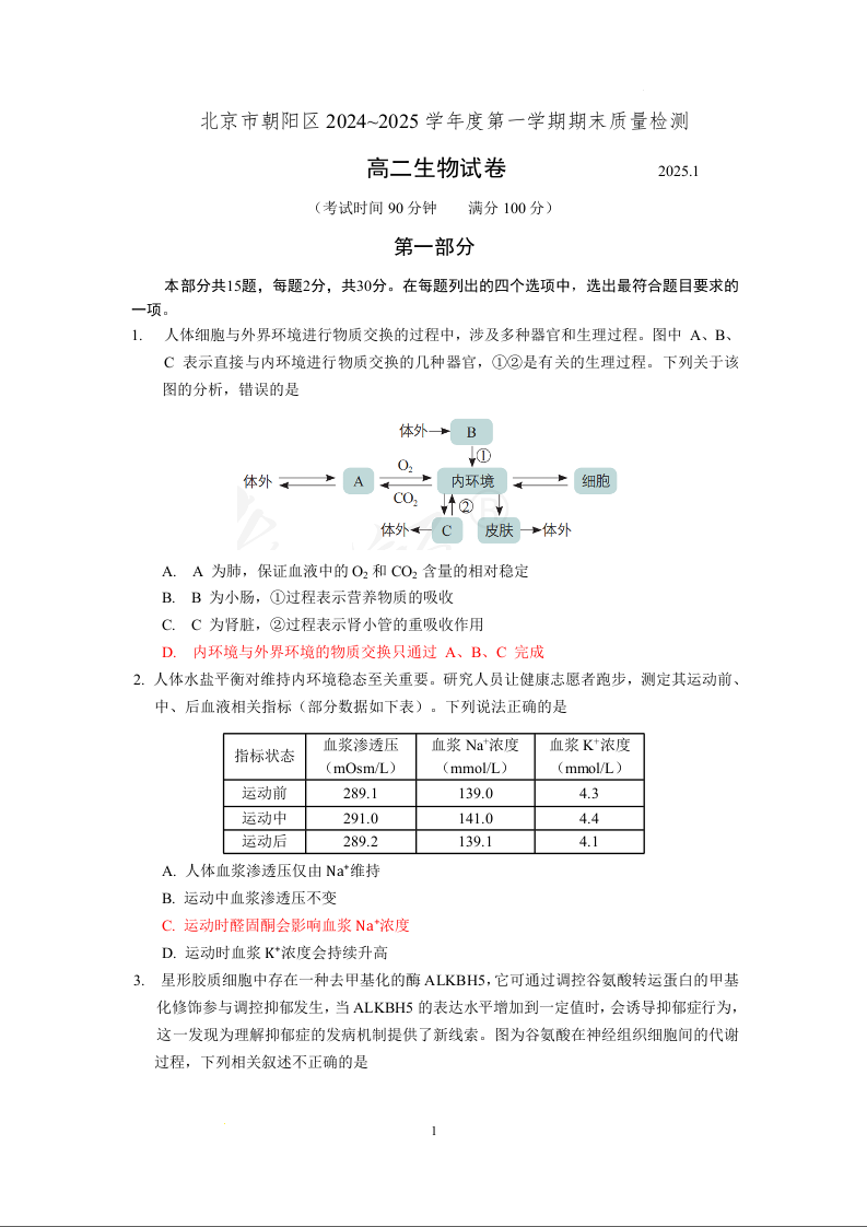 北京市朝阳区2024-2025学年高二年级上学期期末质量检测生物+答案