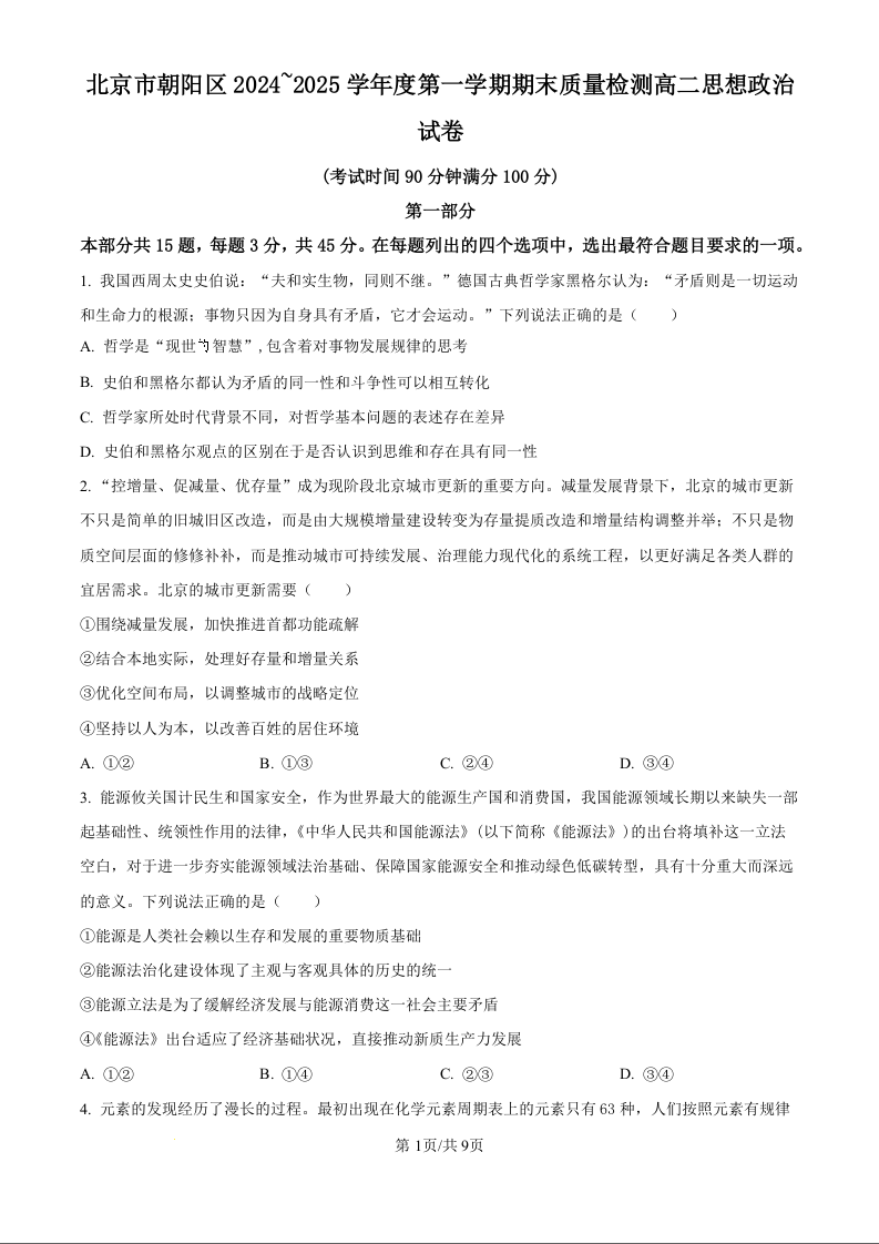 北京市朝阳区2024-2025学年高二年级上学期期末质量检测政治(原卷版)