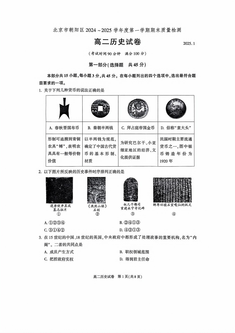 北京市朝阳区2024-2025学年高二年级上学期期末质量检测历史+答案