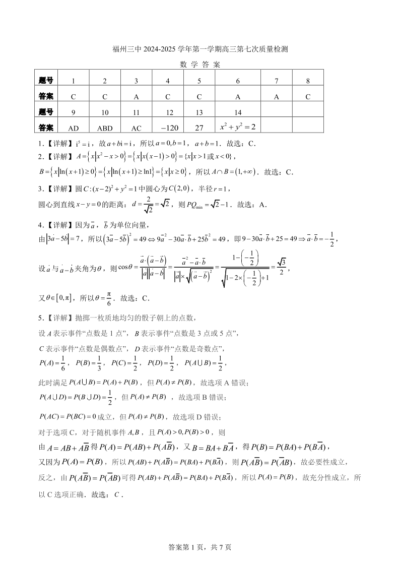 福建省福州第三中学2025届高三上学期第七次模拟数学答案