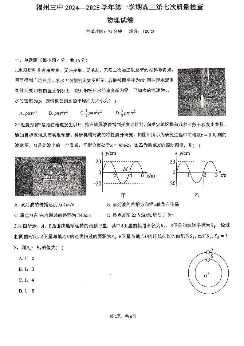 福建省福州第三中学2025届高三上学期第七次模拟物理+答案