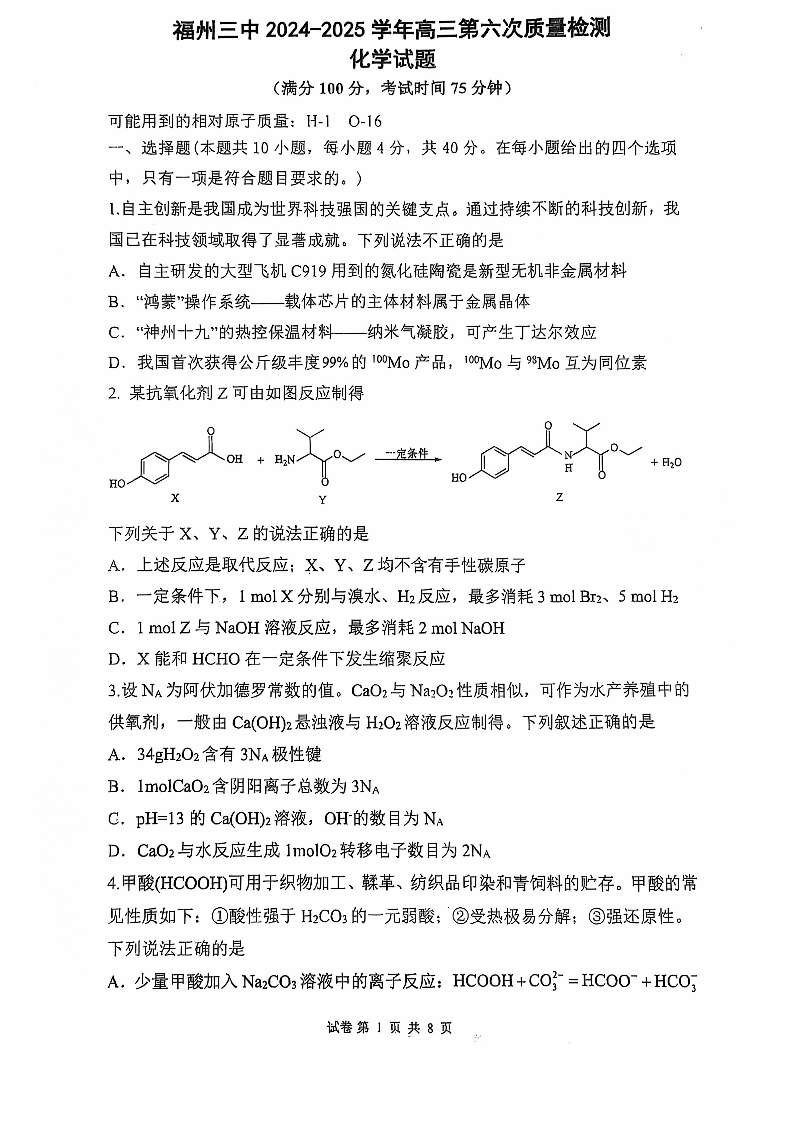福建省福州第三中学2025届高三上学期第七次模拟化学