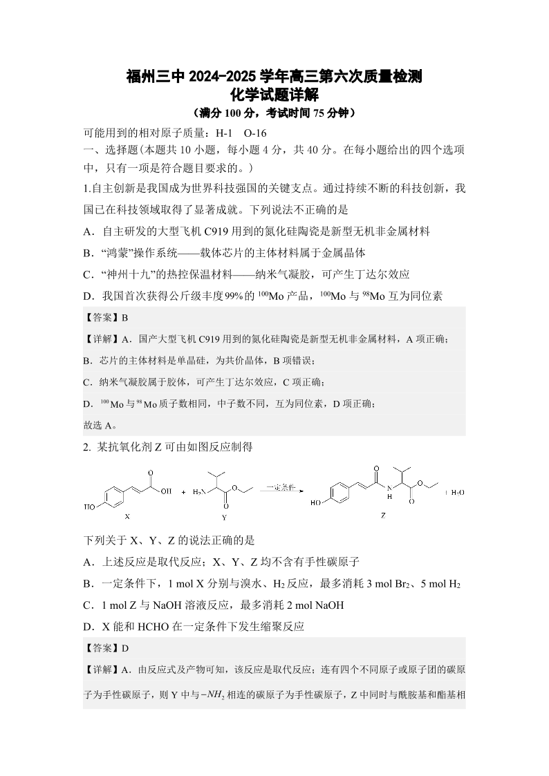 福建省福州第三中学2025届高三上学期第七次模拟化学答案