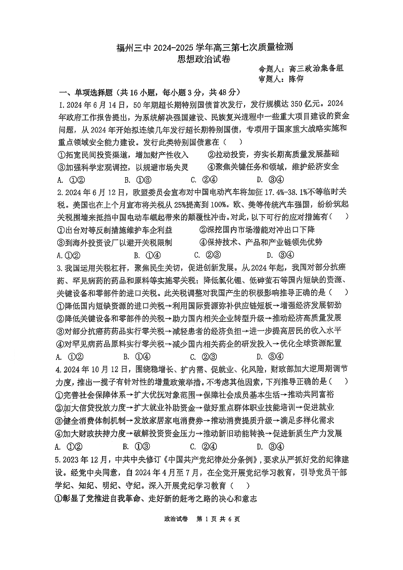 福建省福州第三中学2025届高三上学期第七次模拟政治