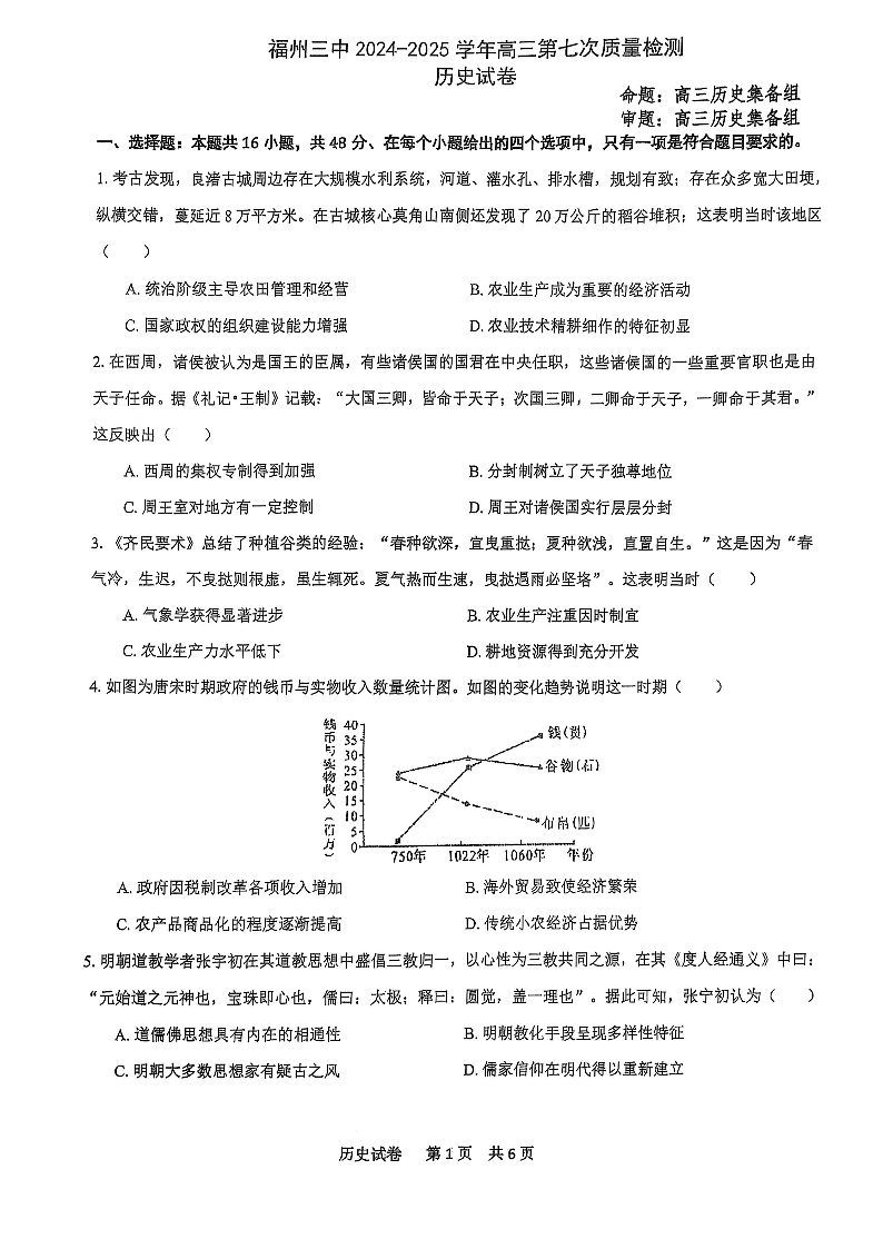 福建省福州第三中学2025届高三上学期第七次模拟历史