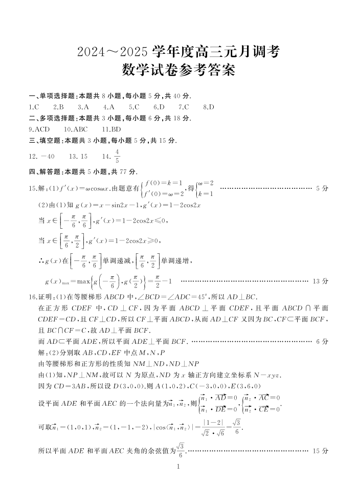 湖北省武汉市江岸区2025届高三上学期1月期末考试数学答案