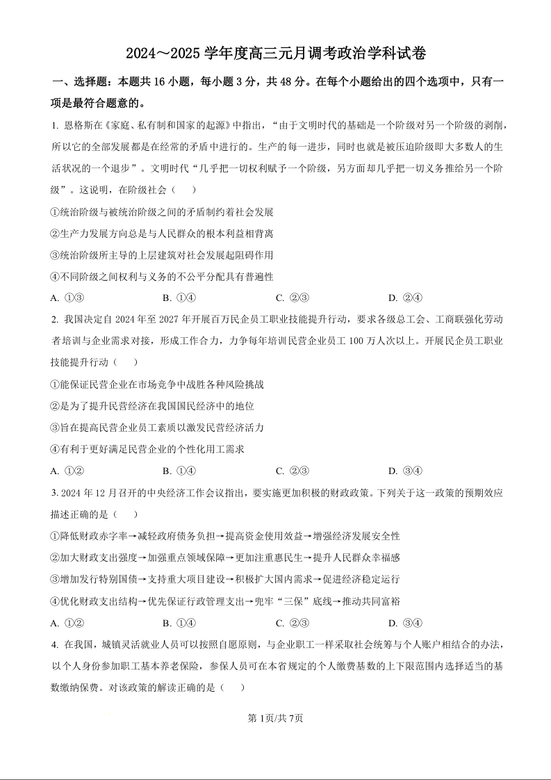 湖北省武汉市江岸区2025届高三上学期1月期末考试政治(原卷版)