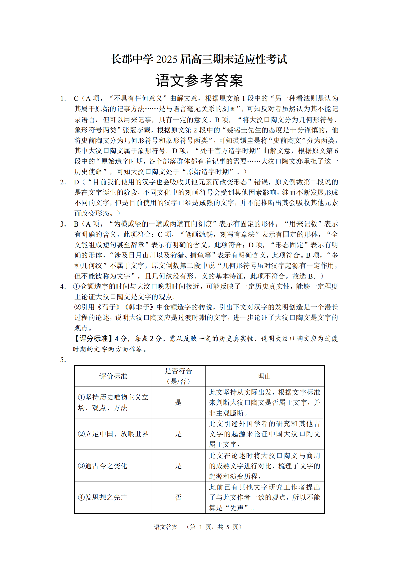 湖南省长沙市长郡中学2025届高三上学期1月期末考试语文答案