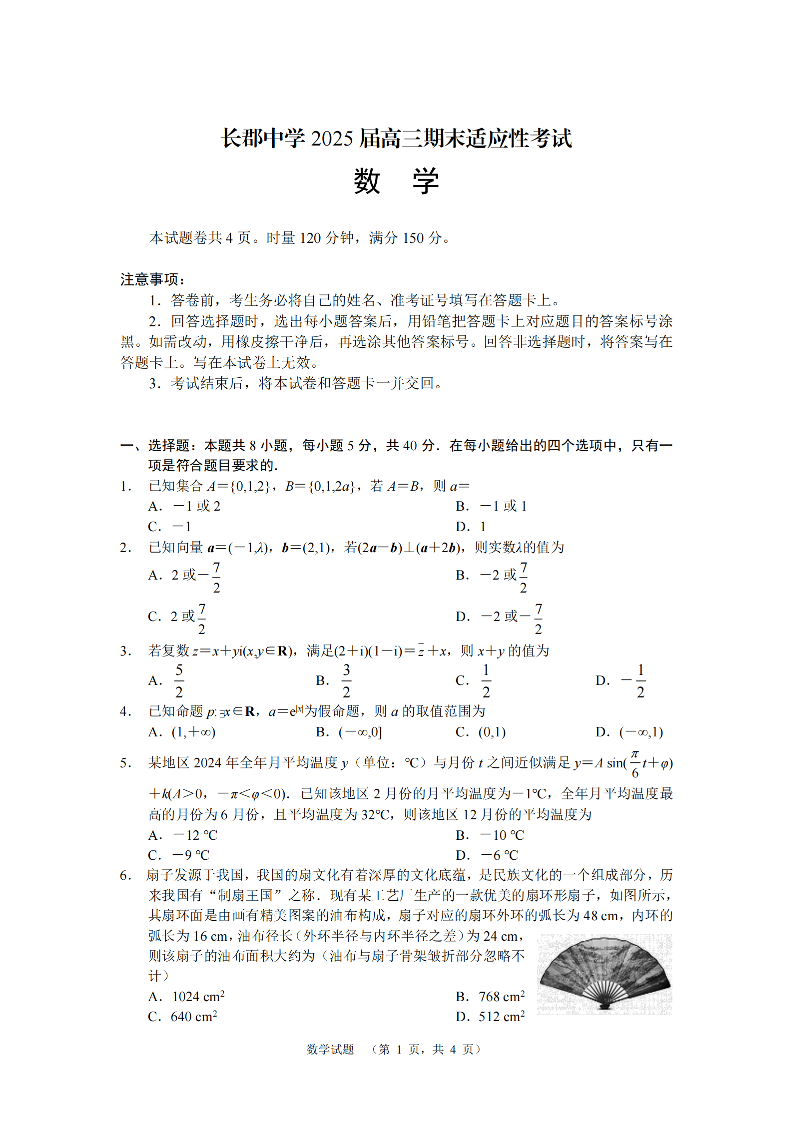 湖南省长沙市长郡中学2025届高三上学期1月期末考试数学
