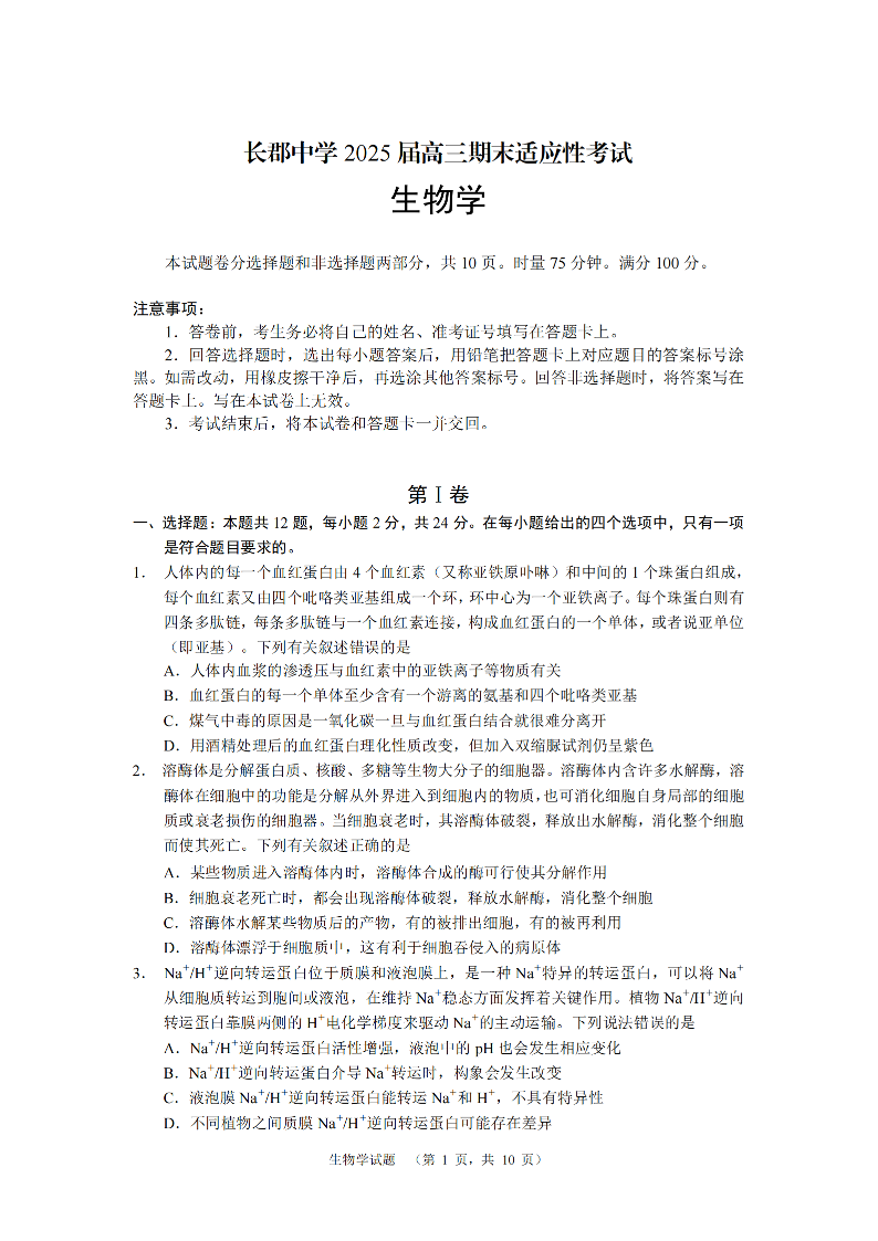 湖南省长沙市长郡中学2025届高三上学期1月期末考试生物
