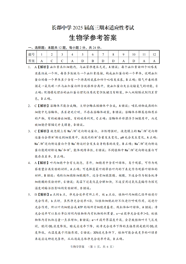 湖南省长沙市长郡中学2025届高三上学期1月期末考试生物答案