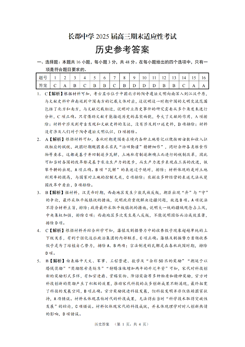 湖南省长沙市长郡中学2025届高三上学期1月期末考试历史答案