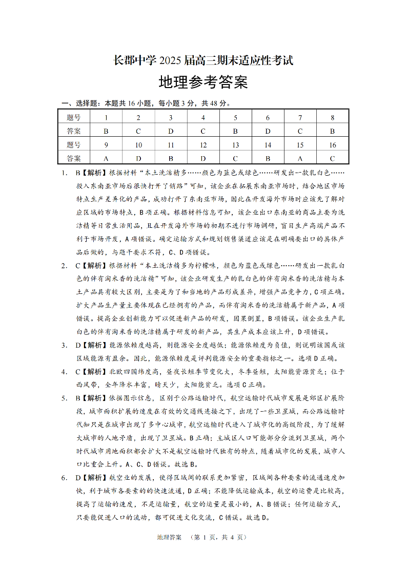 湖南省长沙市长郡中学2025届高三上学期1月期末考试地理答案