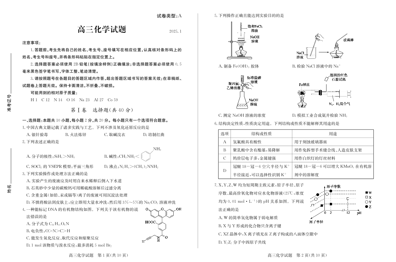 山东省滨州市2025届高三上学期1月期末考试化学