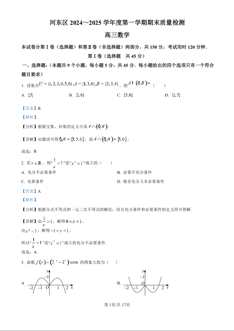 天津市河东区2025届高三上学期1月期末质量检测数学(精品解析版)