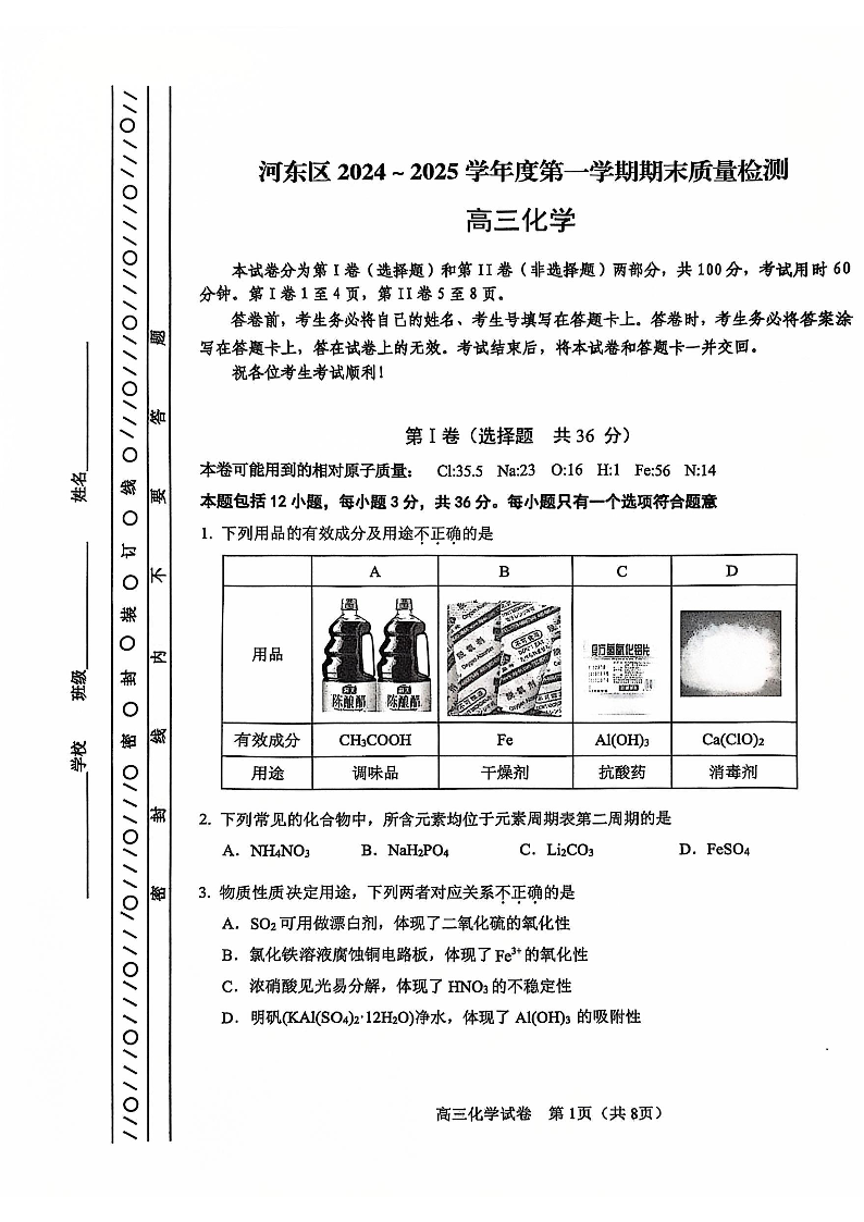 天津市河东区2025届高三上学期1月期末质量检测化学+答案