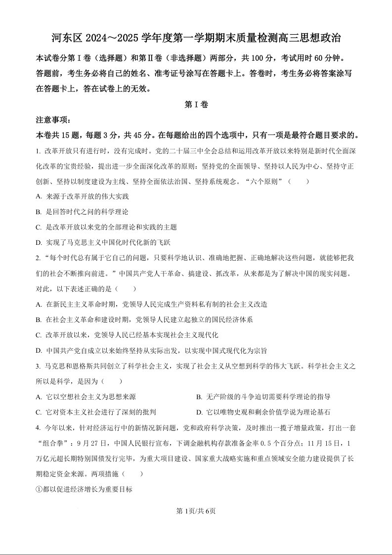 天津市河东区2025届高三上学期1月期末质量检测政治(原卷版)