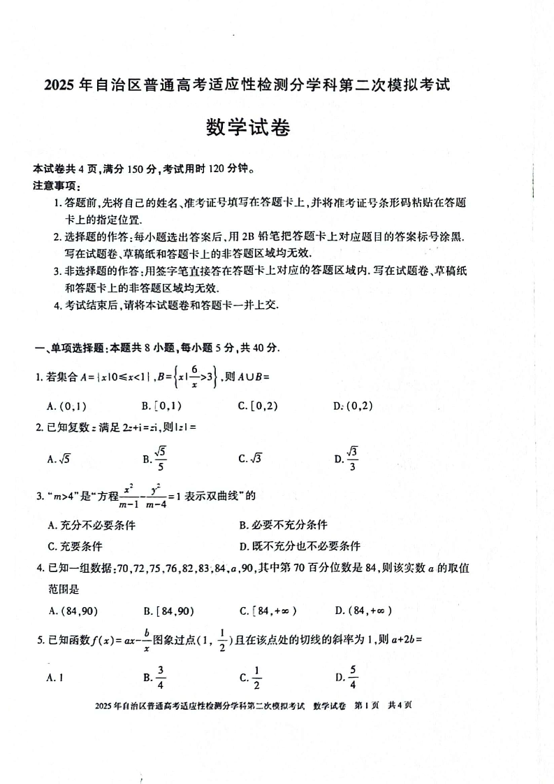 新疆维吾尔自治区2025届普通高考适应性检测分学科第二次模拟考试数学