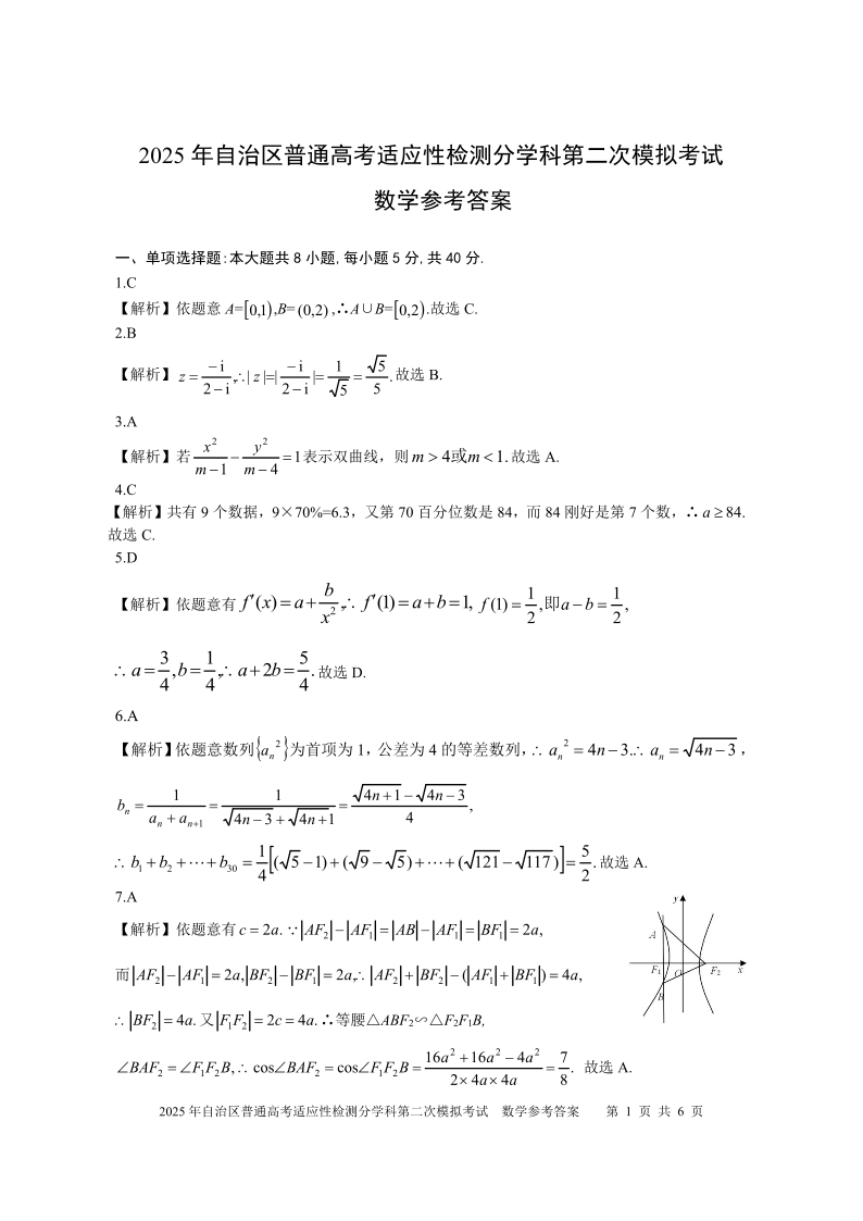 新疆维吾尔自治区2025届普通高考适应性检测分学科第二次模拟考试数学答案