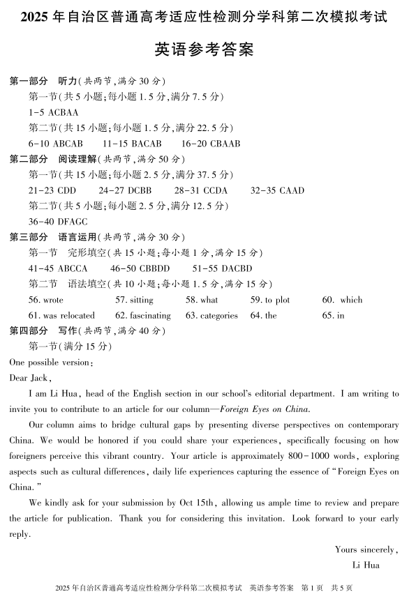 新疆维吾尔自治区2025届普通高考适应性检测分学科第二次模拟考试英语答案