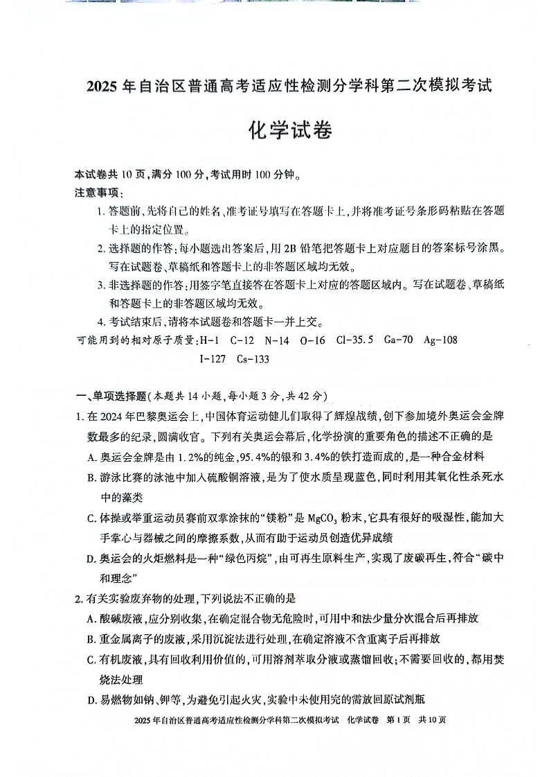 新疆维吾尔自治区2025届普通高考适应性检测分学科第二次模拟考试化学