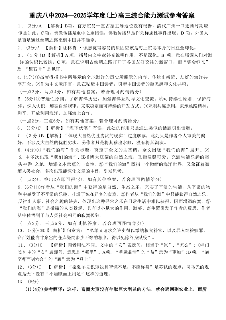 重庆市第八中学2025届高三上学期1月综合能力测试(期末)语文答案