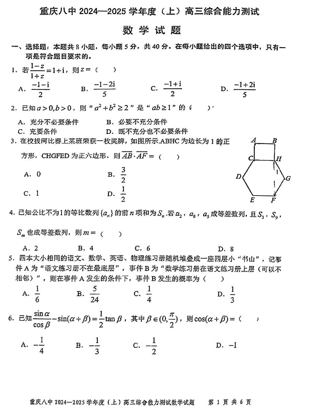 重庆市第八中学2025届高三上学期1月综合能力测试(期末)数学
