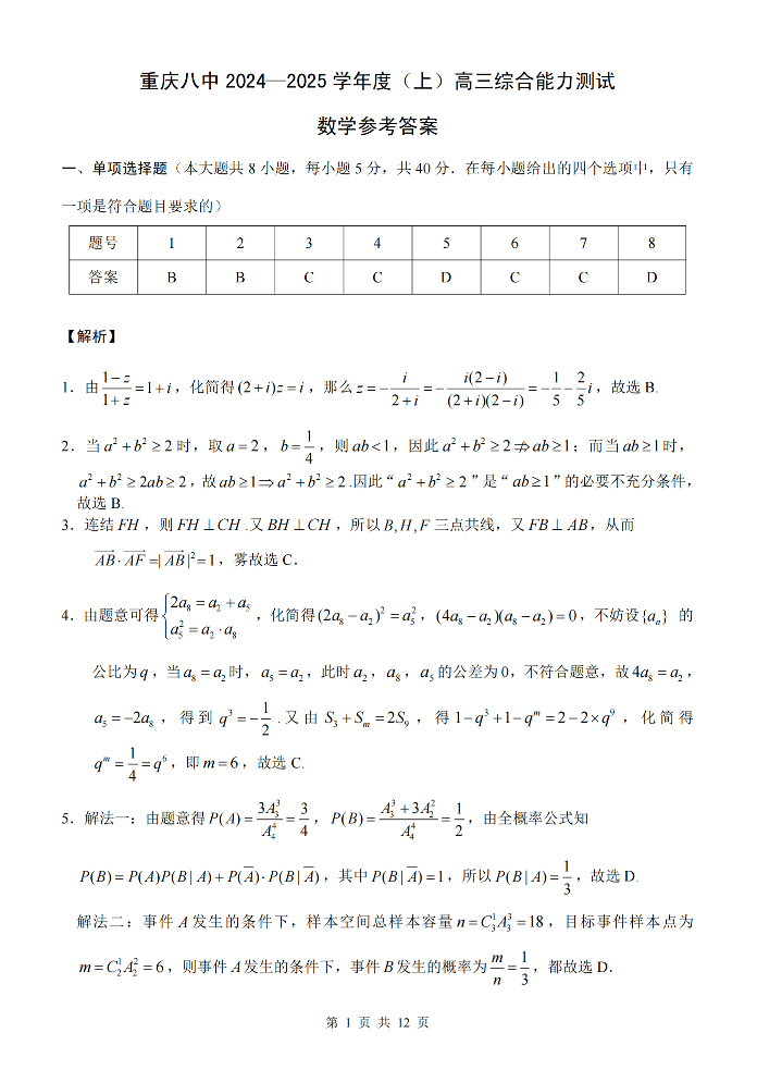 重庆市第八中学2025届高三上学期1月综合能力测试(期末)数学答案